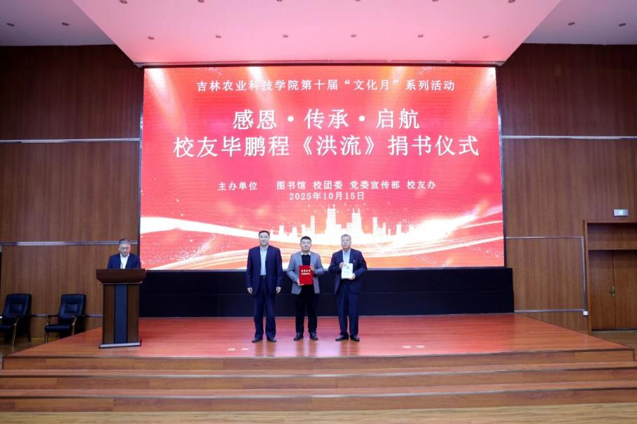捐赠仪式环节,图书馆馆长丛立新代表馆方郑重接收毕鹏程校友的赠书,对其心系母校、助力校园文化建设的举动表示感谢。图书馆党总支书记赵世文为毕鹏程颁发捐赠证书,以表彰其对图书馆文献资源建设的支持。