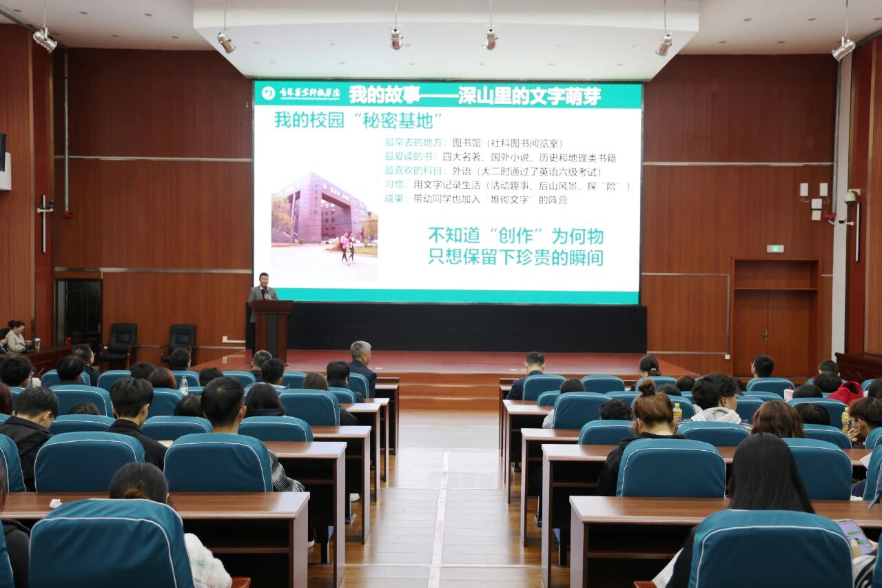 捐赠仪式结束后,活动转入文学讲座环节。毕鹏程校友以自己的长篇作品《洪流》为核心,围绕“我的故事——深山里的文字萌芽”“你们的故事——幸福的象牙塔”“《洪流》的故事——边陲小城的洪水洗礼”三段人生经历展开分享。他结合自身经历,深情讲述了创作的初衷与历程,深入解读《洪流》创作背后,边陲小城遭遇洪水时的人间百态与精神力量。整场讲座中,毕鹏程校友凭借深厚的文学素养与丰富的人生阅历,用真挚的语言鼓励同学们 “热爱生活、积累生活、坚守梦想”,在青春岁月中书写属于自己的多彩篇章,引发在场师生强烈共鸣。